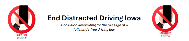 The End Distracted Driving Iowa Coalition is a statewide group comprised of 25 organizations, including representatives from the business, law enforcement, healthcare, labor, transportation, and insurance sectors. The coalition’s mission is to reduce distracted driving by advocating for a comprehensive hands-free driving law in Iowa. By uniting diverse voices, the coalition aims to raise awareness, promote safer roads, and pass this critical legislation during the 2025 Iowa legislative session.