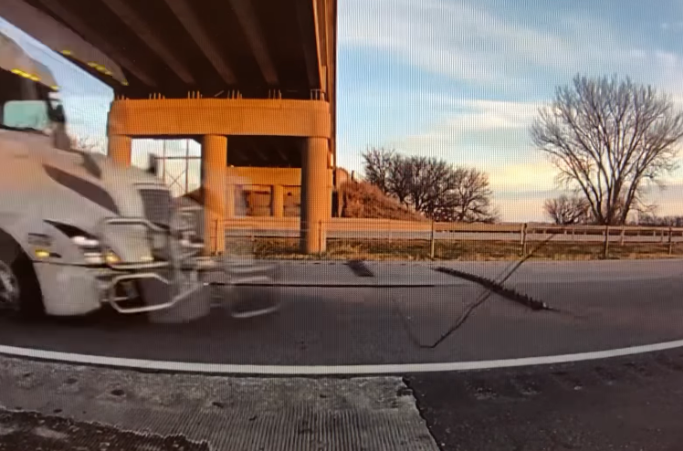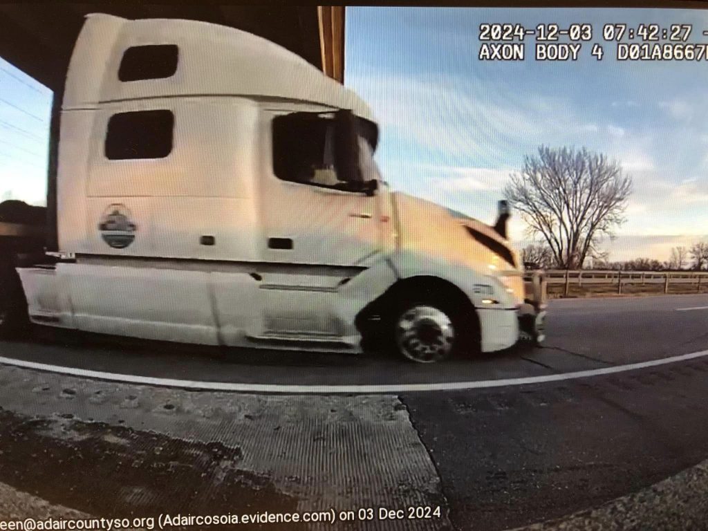 Adair County Sheriff Jeff Vandewater posted on the Adair County Sheriff’s Office Facebook page (Adaircountyso), a brief video taken from his body camera, of the semi passing by his position along I-80, just before he and an Iowa State Patrol Trooper deployed stop-sticks. Vandewater said in one of the still frame photos, you can see the semi was “already driving on its rim at this point.” (Images shown below)