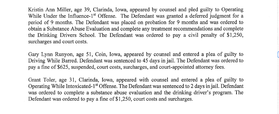 (Clarinda, Iowa) – Page County Attorney Carl M. Sonksen, Tuesday (12/3) issued a report on activities that took place in the Iowa District Court for Page County, during the week of November 25th. The following cases were presided over by the Honorable Amy Zacharias, 4th Judicial District Judge (All persons are presumed innocent until proven guilty in a court of law):
