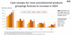 The sale of agricultural commodities is projected to decrease by less than 1 percent overall as an over 8% increase in animal and animal product receipts nearly offsets the over 9% decrease in forecasted crop receipts. Because of this, net cash income for all farm businesses specializing in crops is forecasted to be lower this year than last, but all farm businesses specializing in animal or animal products are expect to have higher net cash farm income than they did in 2023.
