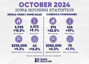 (Des Moines, Iowa) – The Iowa housing market experienced a welcome October surprise, with every metric tracked by Iowa REALTORS® falling into the positive. A late September interest rate drop by the Federal Reserve buoyed buyer and seller sentiments throughout the pinnacle fall month. Iowa Realtors President Shaner Magalhães says “Buyers and sellers across the state enjoyed a bountiful housing market harvest last month. Increases in inventory and sales show that while many Iowans are firmly planted in their homes, there’s opportunity and desire to make moves even in the typically slower fall months.”