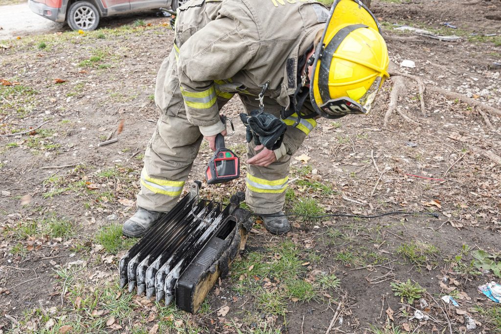 Creston firefighter uses a thermal imaging device to check for hot spots on a heater.