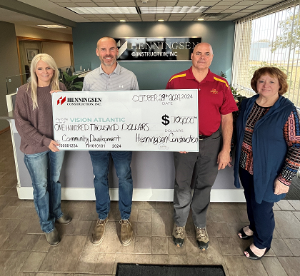 (Atlantic, Iowa) – Officials with the Atlantic Area Chamber of Commerce report Henningsen Construction, Inc., of Atlantic, has donated $100,000 to Vision Atlantic’s transformative project, which will bring a housing development, new childcare center, and YMCA expansion to Atlantic. Henningsen Construction owner Brad Henningsen, says “We are grateful to Vision Atlantic for their commitment to our community. We are happy to support this important project because it addresses needs in our community that will help Atlantic grow and thrive.”