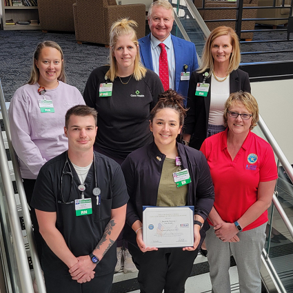 Atlantic, IA— Cass Health Registered Nurse Austin Larson presented the Employer Support of the Guard and Reserve (ESGR) Patriot Award to his leadership team this summer. Larson specifically recognized Inpatient Services Nurse Manager Danielle Powers, RN for her support and also recognized the entire leadership team as playing a role in his continued success navigating both full-time employment and his service in the Guard.