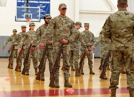 Former Dover Base Honor Guard members practice the ceremonial at ease command during a two-day try-out at Dover Air Force Base, Delaware, Sept. 5, 2024. Seventeen former BHG members went through a tryout process for ceremonial guardsman positions needed for the upcoming presidential inauguration ceremony scheduled in January 2025. (U.S. Air Force photo by Roland Balik)