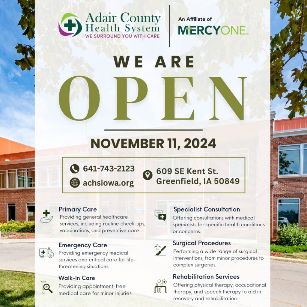 (Greenfield, Iowa) – Officials with the Adair County Health system say they are “Thrilled to announce that Adair County Health System is officially open to all patients,” nearly six-months after an EF-4 tornado tore through the community, killed four people and damaged over 150 homes, as well as the hospital and other businesses. As of now (November 11th), the hospital is open and ready to provide patients and clients “with exceptional care” in their newly renovated facility.
