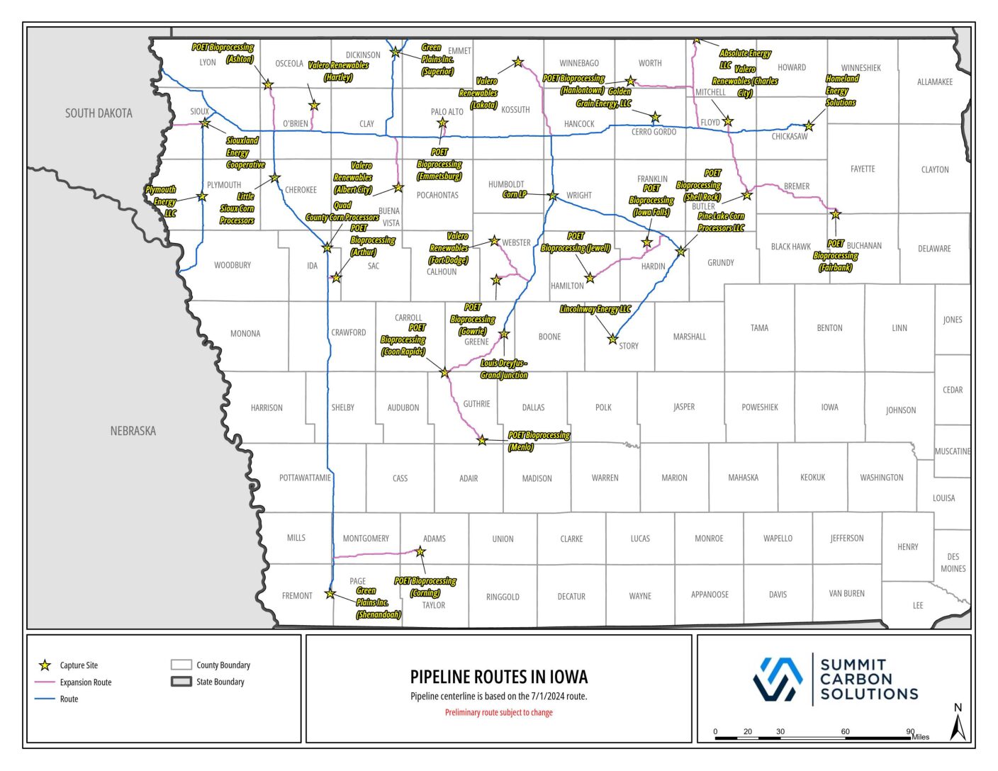 Map of proposed Summit pipeline route through Iowa (Source: Summit Carbon Solutions)