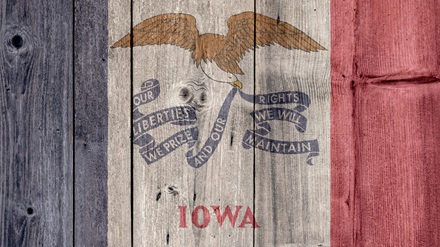 USA Politics News Concept: US State Iowa Flag Wooden Fence