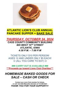 (Atlantic, Iowa) – The Atlantic Lions Club will hold their annual Pancake Supper this Thursday, Oct. 24th, from 4:30-until 7-p.m., at the Atlantic Community Building next to the Cass County Fairgrounds. The cost is $10 per person. Those 12 and under eat for just $5.00. Carry out is available. There will also be homemade baked goods for sale. Proceeds benefit the Lions Club Charities (for example: paying for hearing aids and eye glasses when needed).