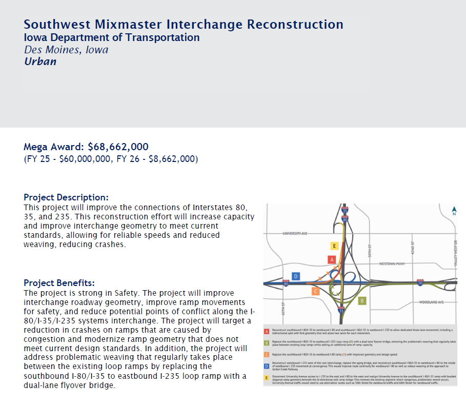 As a resultof today’s (Monday’s) round of selections, Iowa will be receiving $68,662,000 for the Southwest Mixmaster Interchange Reconstruction through the INFRA program. This project will improve the Interstates 80, 35, and 235 interchange. Officials say the reconstruction effort will increase capacity and improve interchange geometry to meet current standards, allowing for reliable speeds and reduced weaving, reducing crashes.