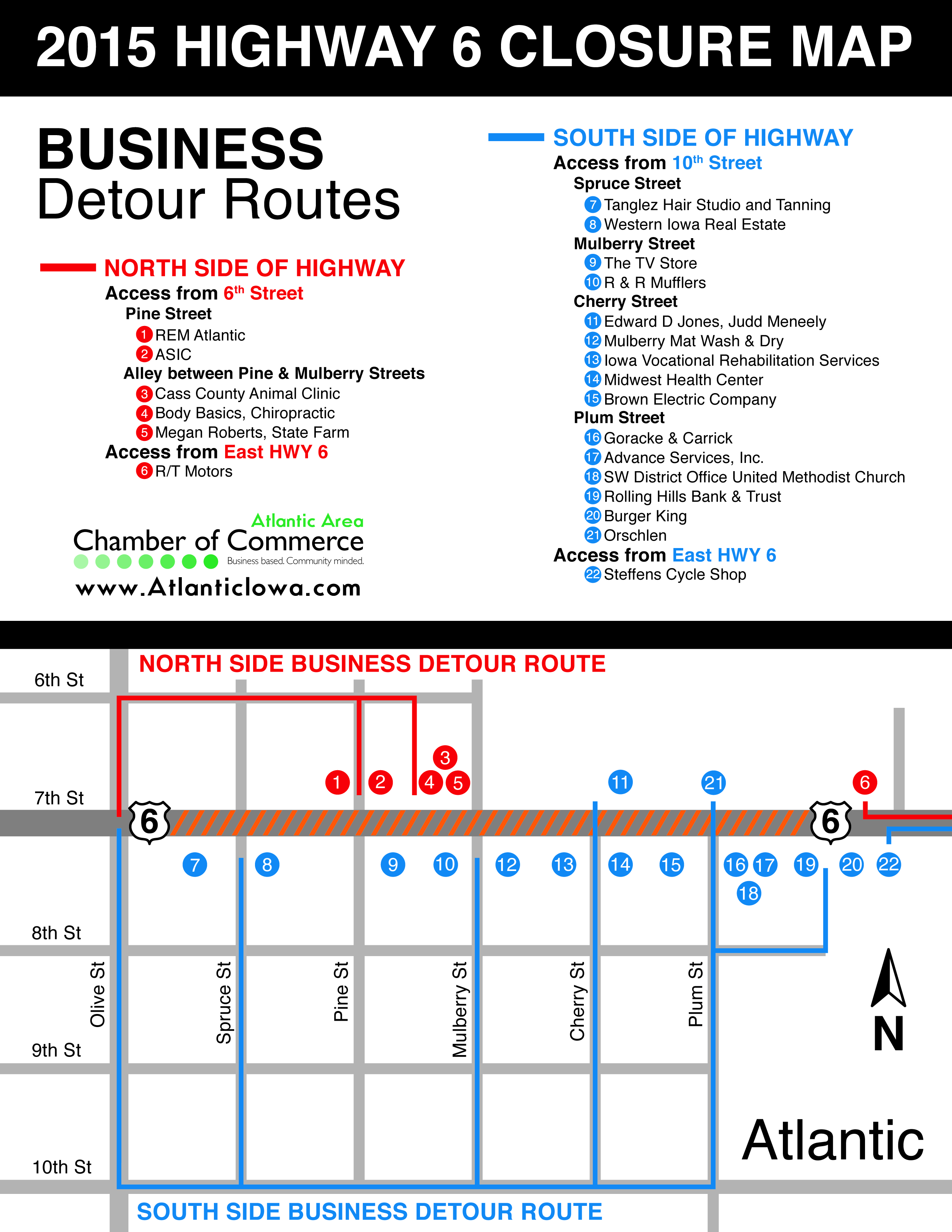 Detour map to local businesses along Hwy 6/7th Street in Atlantic, while construction is underway. (Courtesy Atlantic Chamber of Commerce)
