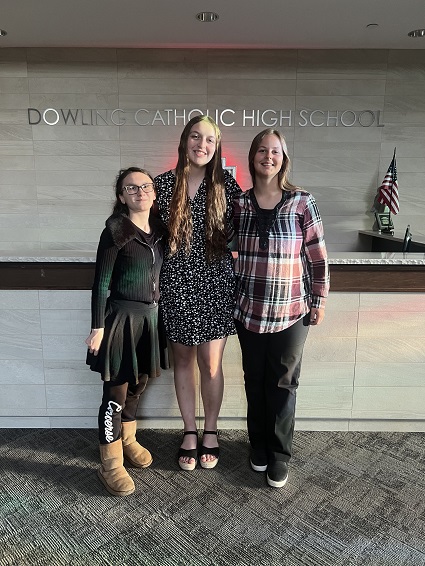 On Saturday, October 5, Sophie Herzberg, Megan Gerlock, and Macy Burg traveled to Dowling Catholic to participate in the IFL opener.  Sophie and Megan both participated in Novice Lincoln Douglas Debate.  Sophie went 3-2 against some tough West Des Moines Valley, Bettendorf and Dowling Catholic students.  Megan went 4-0 and advanced to the finals against West Des Moines Valley.  In a 2-1 decision Megan won and was the IFL Season opener champion in Novice Lincoln Douglas. Macy Burg participated in Informative Speaking on Saturday.  She placed 4th overall with her piece on Natural Disaster Preparedness. (Photos submitted by Coach Thomas)