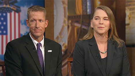 University of Northern Iowa professors Christopher Larimer and Donna Hoffman on the “Iowa Press” set. (Iowa PBS photo)