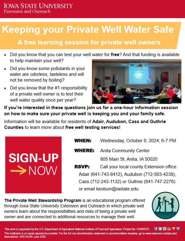 (Area News) – ISU Extension in Adair, Audubon, Cass and Guthrie Counties will host a free, one-hour learning session for private well owners on Wednesday evening, October 9th (2024) at 6-p.m. The program will help attendees understand their well’s water quality and connect them to resources to manage their well. A representative will also be on hand from the Guthrie County Environmental health department, which provides services to all four counties to offer free well-water testing.