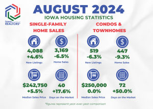 (Des Moines, Iowa) – Officials with the Iowa Association of Realtors, today (Thursday), said the Iowa housing market showed typical signs of a dwindling summer as Iowans settled into their homes for the beginning of the new school year. Anticipated drops in interest rates, coupled with increased inventory outweigh slight dips in metrics tracked by Iowa REALTORS® in August. IAR President Shaner Magalhães says “As we transition into fall, the Iowa housing market is poised for positive developments. With an increase in inventory and anticipated interest rate drops, both buyers and sellers are in a strong position to capitalize on new opportunities. It’s a time for collaboration—buyers can negotiate better terms, while sellers may see a surge in interested buyers. Now is the moment to engage with your REALTOR® to explore the possibilities.”