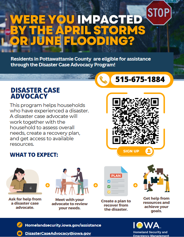 [Council Bluffs, Iowa] – Persons impacted by April storms and June flooding in Pottawattamie County now have access to enhanced capabilities within the Iowa Disaster Case Advocacy Program (DCA). The DCA program addresses serious needs related to disaster-related hardship, injury, or adverse conditions. Disaster case advocates work with clients to create a disaster recovery plan and provide guidance, advice, and referrals to obtain a service or resource. There is no cost for this service or to connect with available resources.