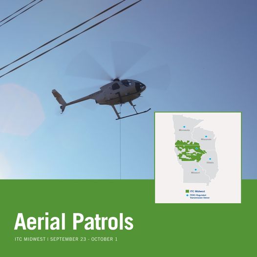 Cedar Rapids, Iowa (September 16, 2024) – Officials with ITC Midwest says they will be conducting aerial patrols of high-voltage transmission structures and lines throughout its service territory from approximately September 23 – October 1, weather permitting. Helicopter patrols provide an overall status of the overhead transmission system owned and operated by