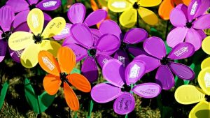 “Purple flowers are if you’ve lost someone to the disease. Yellow flowers are if you are caring for someone right now with the disease. Orange flowers are if you are generally supporting the mission of the organization. And the blue flower is if you yourself are living with the disease,” Livingston says, “and everyone raises up their flowers during the Promise Garden Ceremony and then plants them in the garden.”