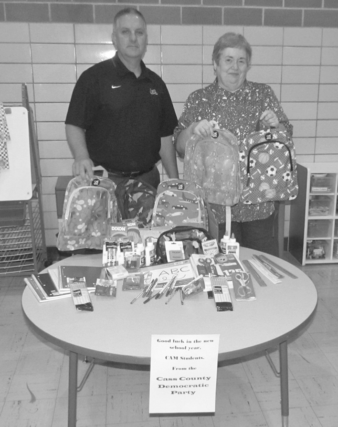 School will be starting soon, and the Cass County Democratic Party wants to help elementary-age children whose families are struggling financially. On August 5th, Sherry Toelle, Chair of the Cass County Democratic Party, presented Larry Hunt, CAM Elementary Principal, with school supplies ranging from pencil-top erasers to rulers to school bags.