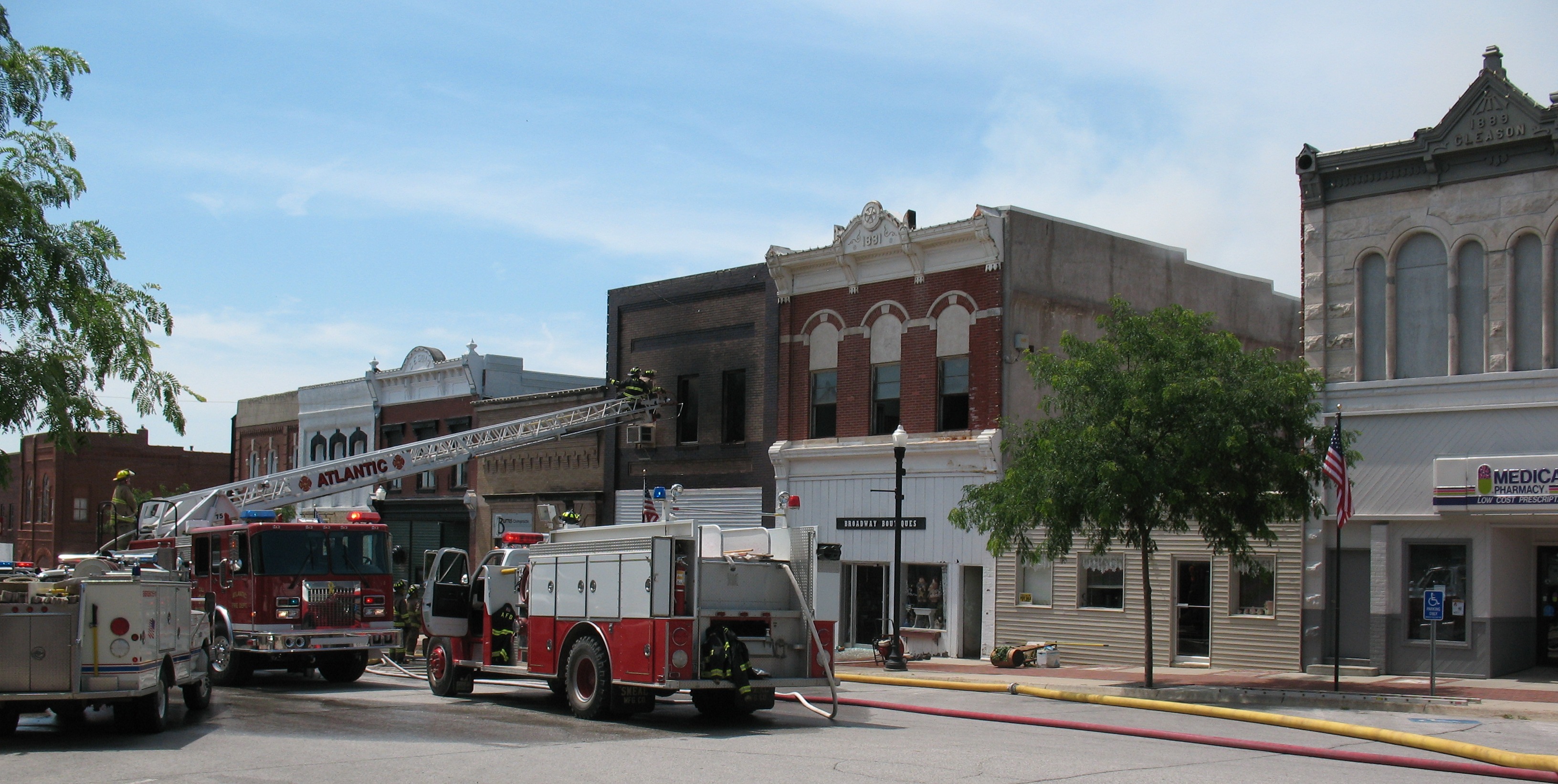 Mayor Sam Kauffman said while he was grateful for the assistance from area fire departments, he especially wanted to thank the Atlantic Fire Department for sending it’s “quint,” or ladder truck equipped with a snorkel. He said that piece of equipment likely prevented the fire from spreading to the adjacent buildings and creating a major disaster.