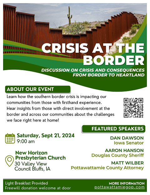 (Council Bluffs, Iowa) — Officials with the Pottawattamie County Republican Party are holding an event September 21, 2024, they are calling “Crisis at the Border: Discussion on Crisis and Consequences: From Border to Heartland.” The event takes place at the New Horizon Presbyterian Church (30 Valley View Drive) in Council Bluffs, beginning at 9-a.m. Officials say during the event, pressing issues surrounding the southern border crisis and its direct impact on our local communities will be explored. Attendees will hear from distinguished speakers with an array of experience, be it firsthand experience fighting the immigration at the southern border or fighting and prosecuting the crisis as it impacts residents in the heartland.