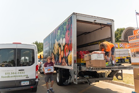 Food rescued is in addition to thousands of pounds of food donated by fairgoers on Sunday, Aug. 18. That will be sorted and weighed in the coming days. Emily Shearer, Food Bank of Iowa’s senior manager of food acquisition and advocacy said “With some vendors selling out of their most popular menu items by the last day of the fair, it only makes sense there would be fewer leftovers this year. We are grateful to these generous fair vendors who want to prevent waste as well as share food with neighbors facing hunger. We’re also thankful for our volunteers who helped pick up food today and collected donations from fairgoers at all the gates.”