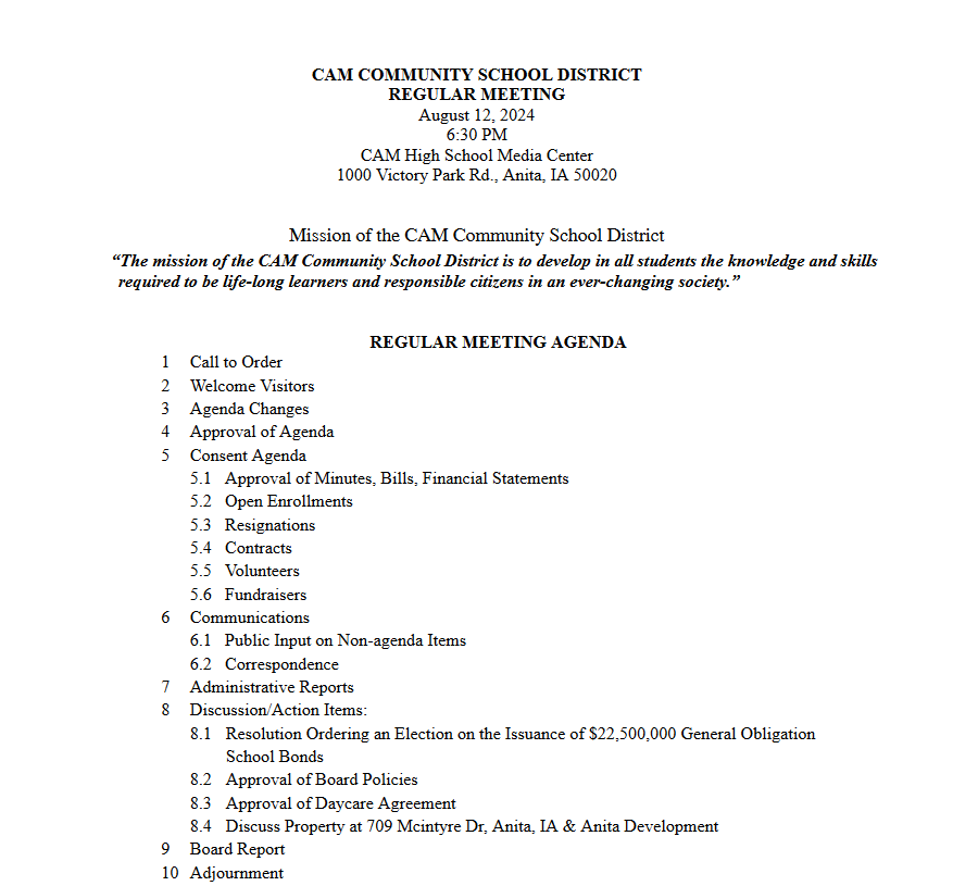 The CAM School Board is set to meet Monday evening, in Anita. Here is the agenda: