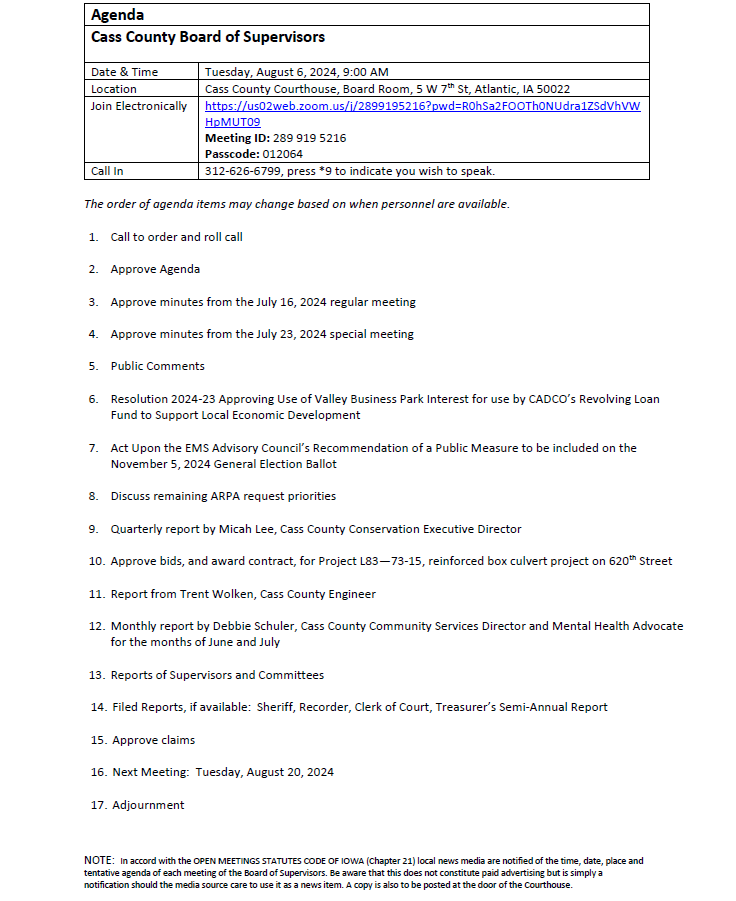 (Atlantic, Iowa) – The Cass County Board of Supervisors are set to meet at 9-a.m. Tuesday, Aug. 6th in their Atlantic courthouse Board Room. On their agenda, is: Action on a resolution approving the use of Valley Business Park (VBP) interest for use by CADCO’s (Cass-Atlantic Development Corporation) Revolving Loan Fund (RLF) to support local economic development; action on the EMS Advisory Council’s recommendation to place a Public Measure on the November General Election ballot, with regard to making Emergency Medical Services an essential service in Cass County, and an associated levy that supporters say will provide a revenue stream that is a dedicated county fund that can’t be redirected by politicians to less important needs.