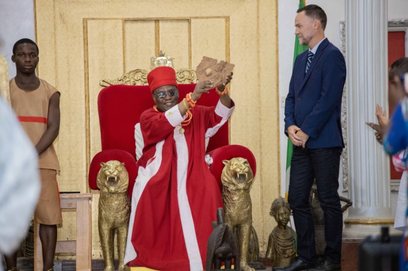 His Majesty, Oba Ewuare II, holds up the brass plaque presented to him by Dr. Cory Gundlach (right) during the restitution ceremony at the Royal Palace. (Photo courtesy Stanley Museum of Art)