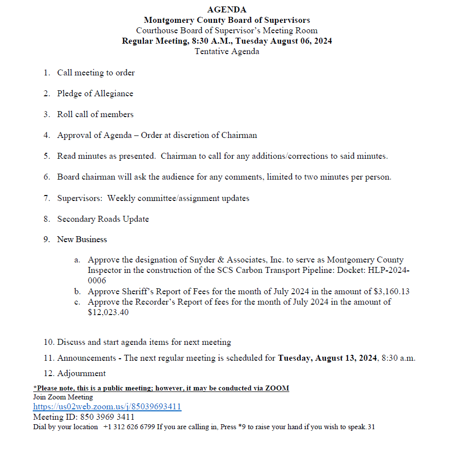 (Red Oak, Iowa) – The Board of Supervisors in Montgomery County will hold their regular, weekly session on Tuesday (Aug. 6) beginning at 8:30-a.m. On their agenda is action on approving the designation of Snyder and Associates, Inc., to serve as Summit Carbon Solutions pipeline inspector during construction of the carbon transport pipeline.