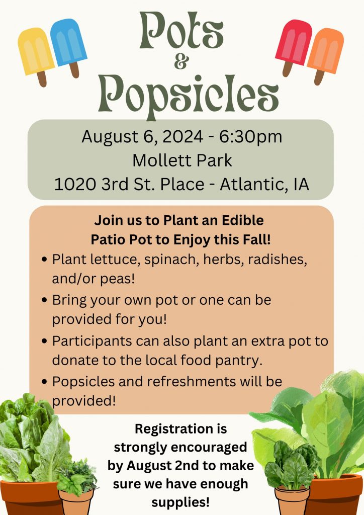 (Atlantic, Iowa) – The Cass County Grow Another Row Committee is hosting a free event at Mollett Park on August 6, 2024, at 6:30 pm. “Pots and Popsicles” is a free class to learn about patio gardens. Participants can plant lettuce, spinach, herbs, radishes, and/or peas to keep on their patios. This free educational gardening event will help participants learn how to plant, care for, and harvest late-season plants to enjoy this fall. Popsicles and refreshments will be provided.