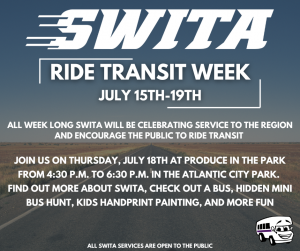 SWITA will be celebrating Ride Transit Week with many offerings, highlighted by an appearance on Thursday, July 18th at Produce in the Park in Atlantic City Park. Stop by and see the SWITA crew for fun, prizes, and information. Mini SWITA buses will be hidden throughout the park for visitors to find and return to the SWITA table for a prize. Other activities will include kids’ handprint painting on a flag, a chance to check out a SWITA bus, information available about services and how to sign up, and other fun and giveaways.