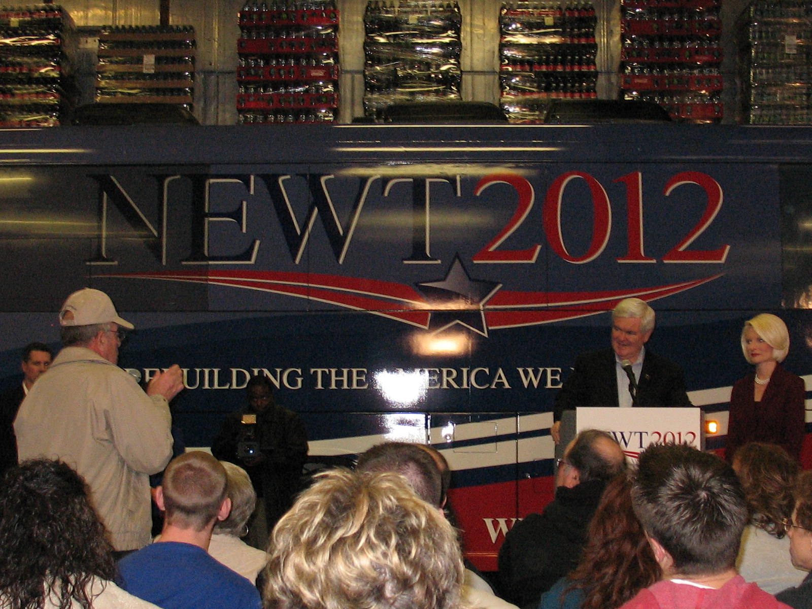 Republican presidential candidate Newt Gingrich brought his “Newt’s Jobs and Growth” bus tour to Council Bluffs and Atlantic, Saturday. In Atlantic, he spoke before a crowd of about 100-people at the bottling plant, about the tone of the advertisements that have been run against him, and in general. He said “It will be interesting to see whether in fact the people of Iowa decide that they don’t like the people who run negative ads, because you could send a tremendous signal to the country that the era of nasty and negative 30-second campaigns is over and that sense, you could have a very, very big impact.”