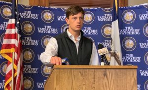 State Auditor Rob Sand, speaking at a recent news conference in his statehouse office. (RI file photo)