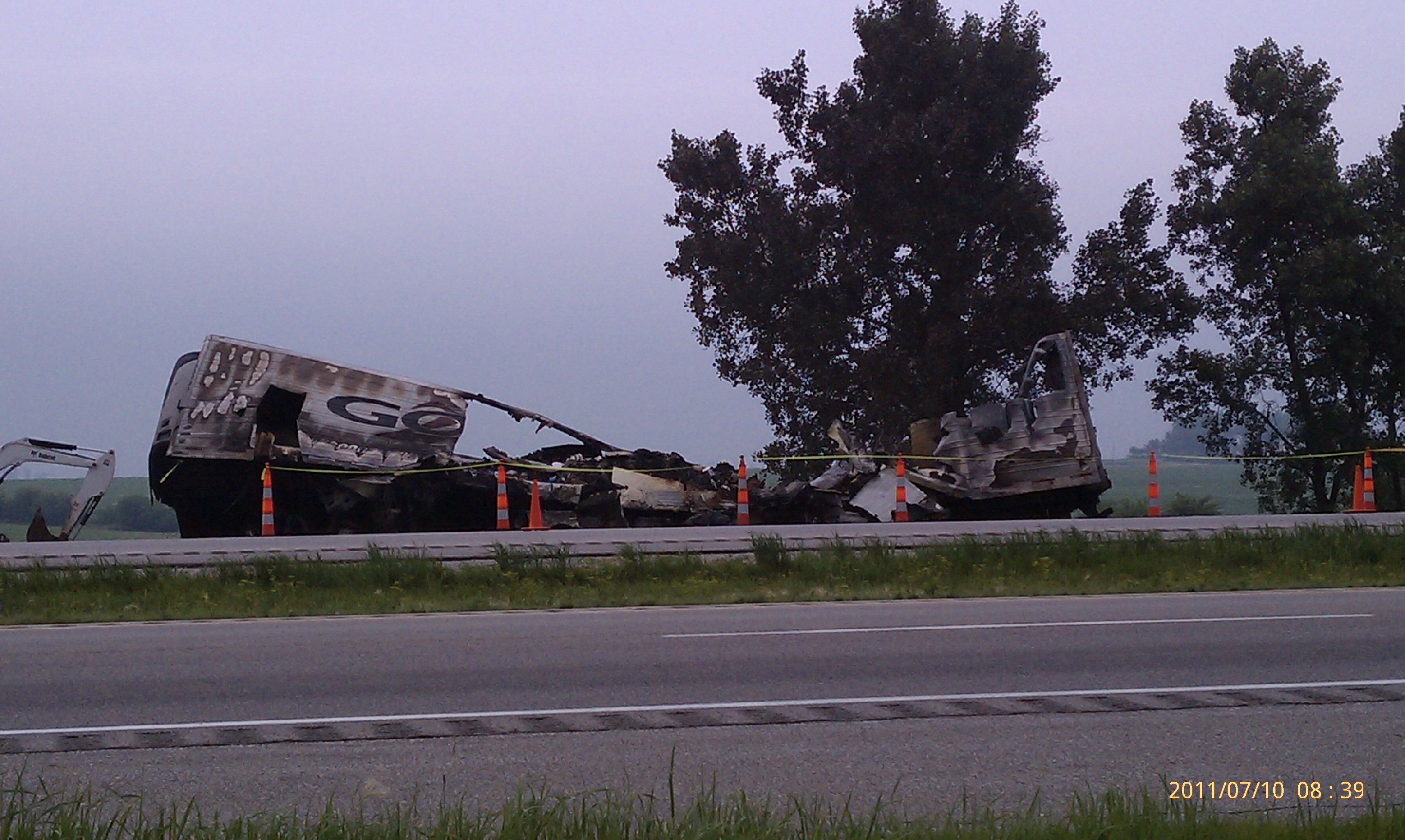 The blaze occurred just east of the westbound I-80 exit-ramp at Exit 86 (Hwy 25), two-miles west of Menlo. A detour was established while the wreck was being cleared up. The incident happened at around 3:42-p.m.