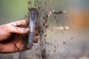 Taking a soil sample for a soil test in a field. Testing carbon sequestration and plant health in Australia.