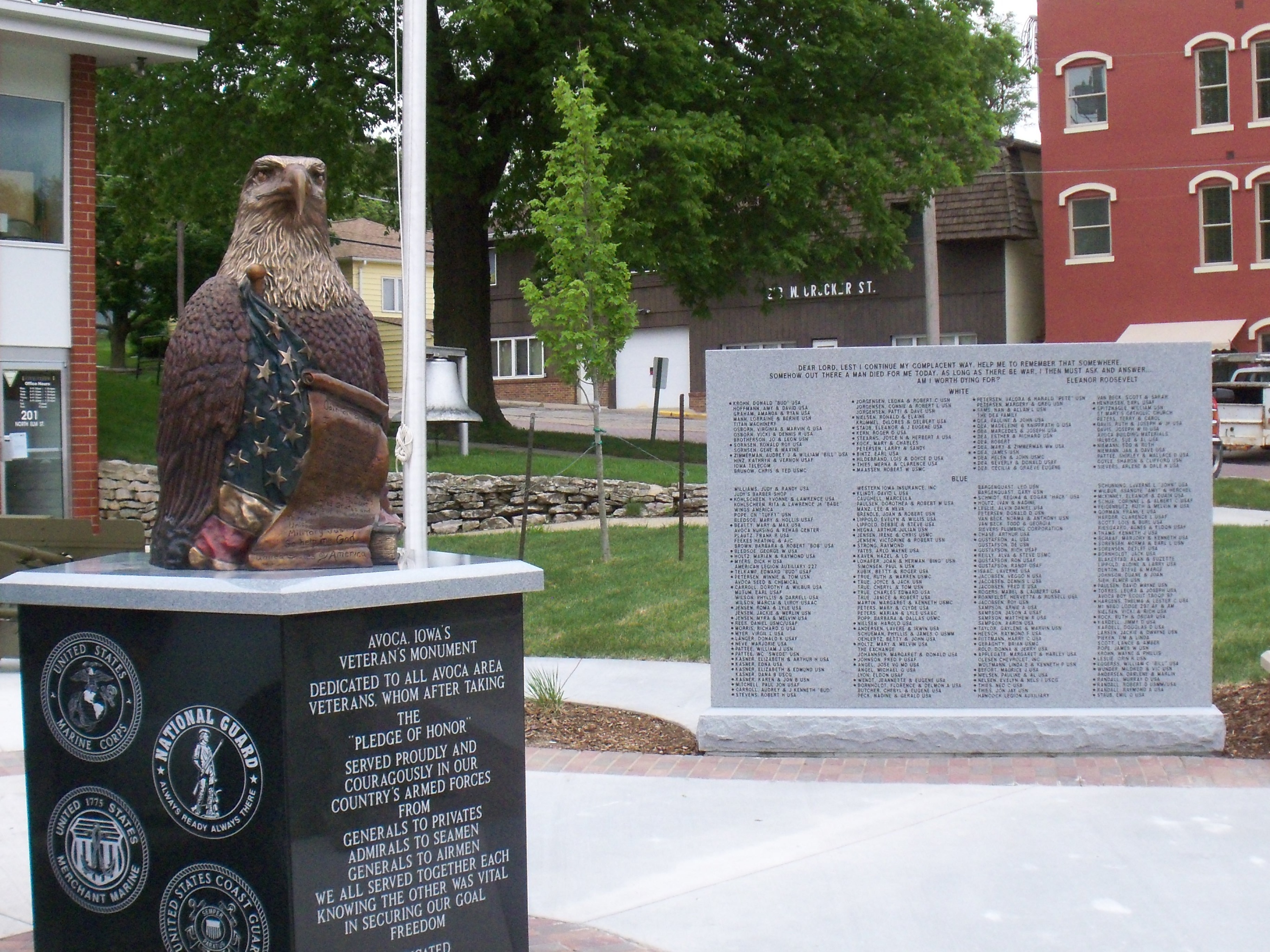 Neola artist Russell Christensen was commissioned to design and create the bronze eagle sculpture series to serve as veterans’ memorials in Avoca and 11 other communities in Pottawattamie County. Each community raised $25,000 to help pay for the statue, which stands about 36-inches tall and is perched on a granite pedestal. The effort to bring the bronze eagle to Avoca began with the formation of a committee, in May of 2006.