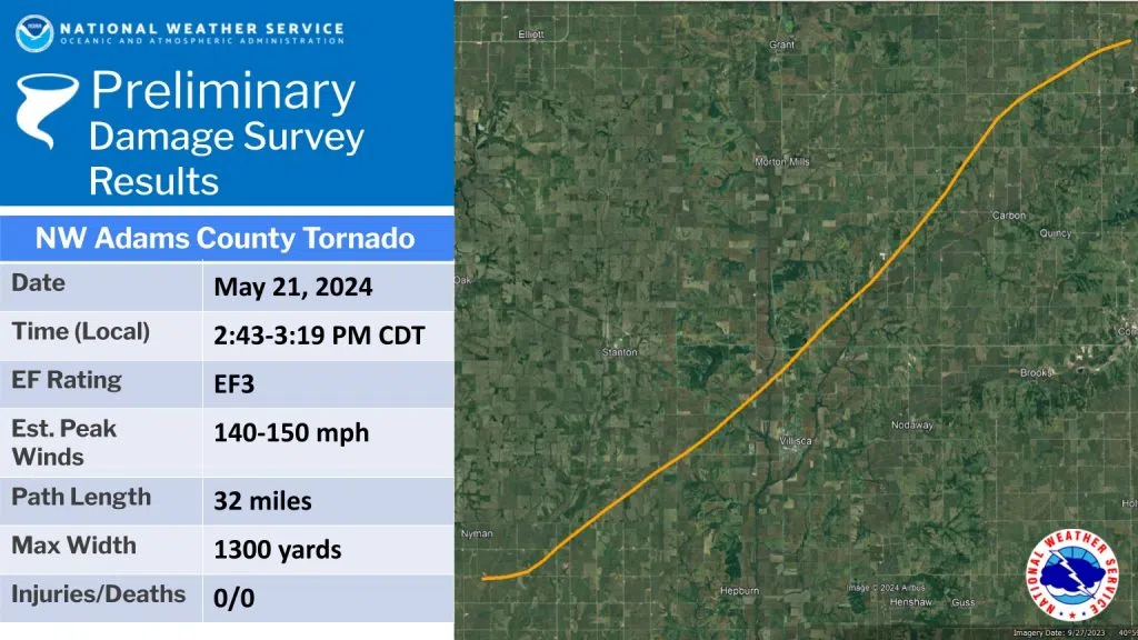 (Des Moines, Iowa) – Officials with the National Weather Service report that a tornado affecting parts of Page, Montgomery and Adams counties has a preliminary rating of EF-3, with estimated peak winds of 140-to 150-miles per hour. The event began at 2:43-p.m. and ended at 3:19-p.m. The 1,300 yard wide tornado traveled 32 miles.