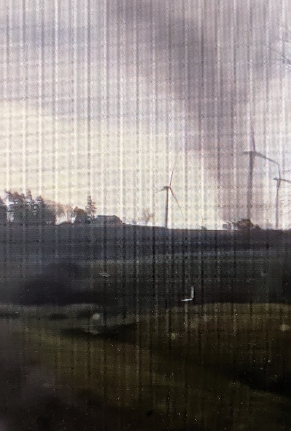 (Massena, Iowa) – Volunteer Firefighter Levi Lank captured video of a tornado located three-miles southwest of Massena off of Victoria Road, this (Sunday) evening. The twister touched down at around 7:58-p.m. There were no reports of damage or injuries. (Still frame images from the video, Photo credit: Levi Lank). While the National Weather Service had issued a Severe Thunderstorm Warning for southeastern Cass and southwestern Adair Counties just before 8-p.m., there was NO TORNADO WARNING issued. The Cass County Communications Center set-off the sirens in Cumberland and Massena when spotters observed the twister.