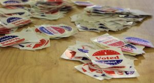 “I voted” stickers are scattered over a table at a polling site in Des Moines on Nov. 3, 2020. (Photo By Perry Beeman/Iowa Capital Dispatch)