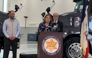 Iowa Attorney General Brenna Bird speaks during news conference at Housby Co. in Ankeny. She was joined by Dale Decker of Decker Truck Line, on left, and Iowa Motor Truck Association chair Scott Szymanek on right. (RI photo)