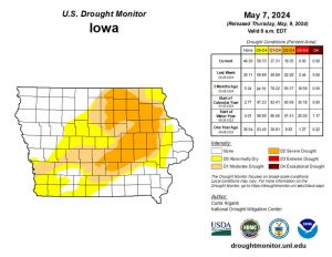 (Radio Iowa) – The latest U-S Drought Monitor map of Iowa shows no red areas indicating extreme drought.