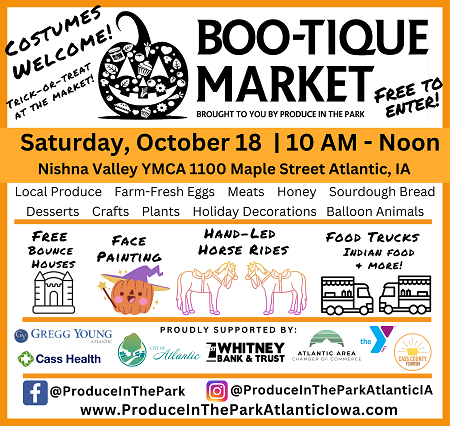 ATLANTIC, IA (October 13, 2025) – Produce in the Park is hosting BOO-tique Market on Saturday, October 18, at the Nishna Valley YMCA from 10 AM to noon. BOO-tique Market is a new Halloween-themed farmers market. In addition to lots of fresh, local fall produce and other local foods and handmade crafts, the event will include lots of spooky, fall fun. Kids will be delighted to find hand-led horse rides, face painting, balloon animals, free bounce houses made possible by the YMCA, and a free spider plant craft activity hosted by Imagine at Zellmer Century Farm.There is no cost to enter the YMCA for the BOO-tique Market, and Halloween costumes are welcome. Trick-or-treating will be available throughout the market.