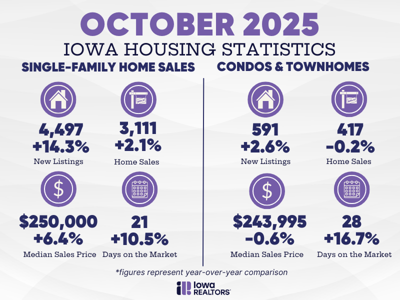 Median sales price increased across the board to $250,000; jumping 6.4% from the $235,000 of a year ago, and 2.5% from the $244,000 of September. Following suit, days on the market increased 10.5% to 21 days from the 19 recorded in October 2024, and 5% from the 20 days last month. Continued momentum in the market could bode well for both buyers and sellers as we enter the typically slower winter housing market season, said Les Sulgrove, Iowa REALTORS® statewide housing analyst. “As we head into the winter months, we typically see a seasonal slowdown, but the current momentum suggests activity may stay stronger than usual,” Sulgrove said. “With more inventory available and buyer confidence holding steady, we could see continued movement even in what’s traditionally a quieter market.”