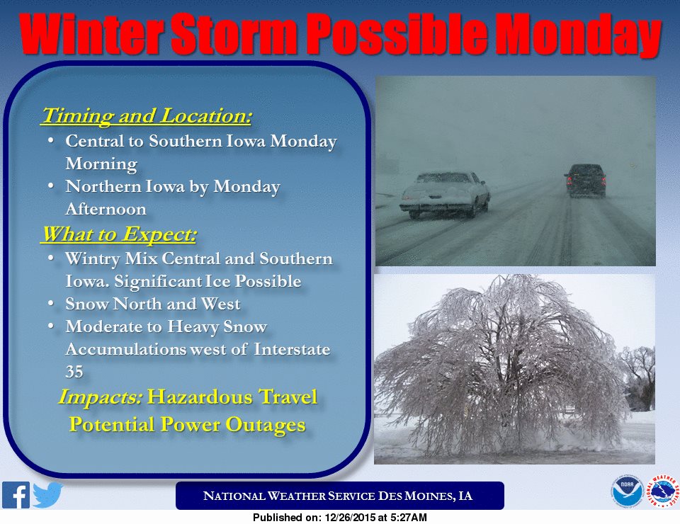 The National Weather Service in Des Moines says a significant winter storm is expected to impact much of Iowa on Monday into early Tuesday. Officials say a strong low pressure system will bring widespread precipitation in the form of a wintry mix to central and southern Iowa Monday morning before gradually switching to snow during the afternoon hours.