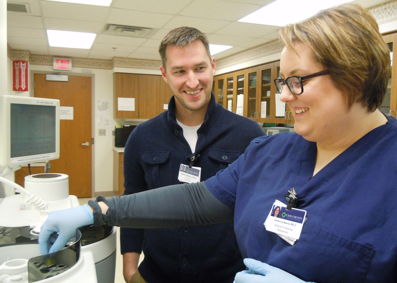 CCHS employees Mitch Whiley, MLS (ASCP) and Chelsea Johnson, MLT are shown working together in the laboratory. The CCHS Foundation 2016 Campaign funds will go towards the purchase of new equipment for the department.