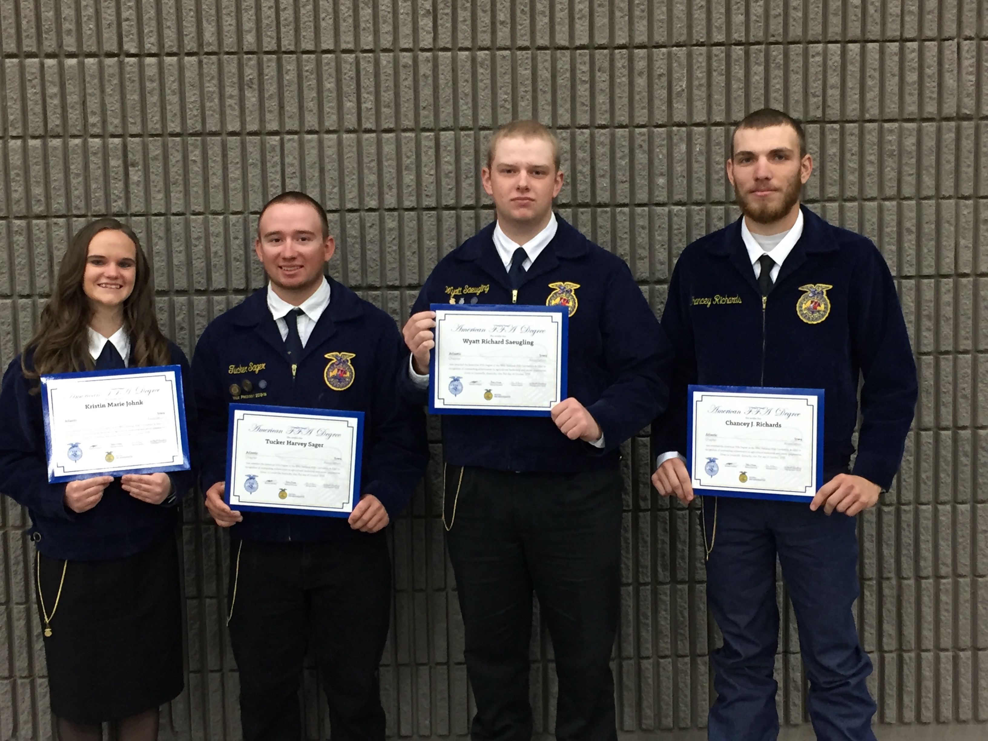 Each recipient of the American FFA Degree receives a gold American FFA Degree key, certificate and matted frame after being recognized on stage at that national convention. Wyatt Saeugling said, “I was glad to make the trip down to Louisville and receive my American FFA Degree. It’s really cool to see all of the other kids our age pursuing the same passion for agriculture that I have. I’m also excited to see where the ag industry will be within the next few years.” Kristin Johnk said “It is a great honor to have received this award, being among the 1% that attain this award nationally. This has been an opportunity of a lifetime and we couldn’t have done it without the help of our former FFA Advisor Mr. Bruce Johnk, current advisor Mr. Eric Miller, our families, and others in the community who have encouraged the four of us to pursue this degree.” Tucker Sager said, Getting my American Degree was a great learning experience that I had to work hard to get, but it was worth it.