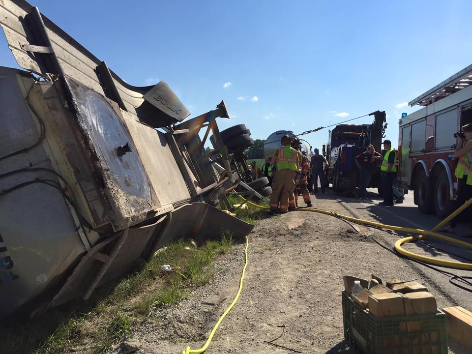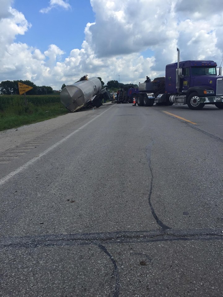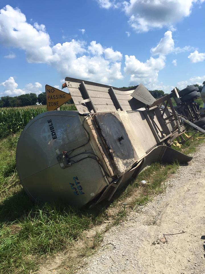 When Eldridge pulled the semi off onto the shoulder of the road, the trailer became disconnected and rolled into a ditch, spilling about 5,200 gallons of beef broth. Crews were able to transfer the remaining liquid contents into another trailer, and set the damaged tanker up-right.