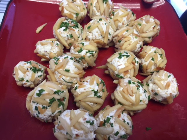 Roast almonds and sesame seeds, separately. In a bowl, beat together cream cheese, Parmesan cheese, sesame seeds and onion. Season with salt and pepper. Cover; refrigerate until firm, 20 minutes or more. Shape into 20 to 25 balls. Rolls balls in almonds (and parsley or chives if using). Refrigerate until ready to serve. May be made several days before serving.