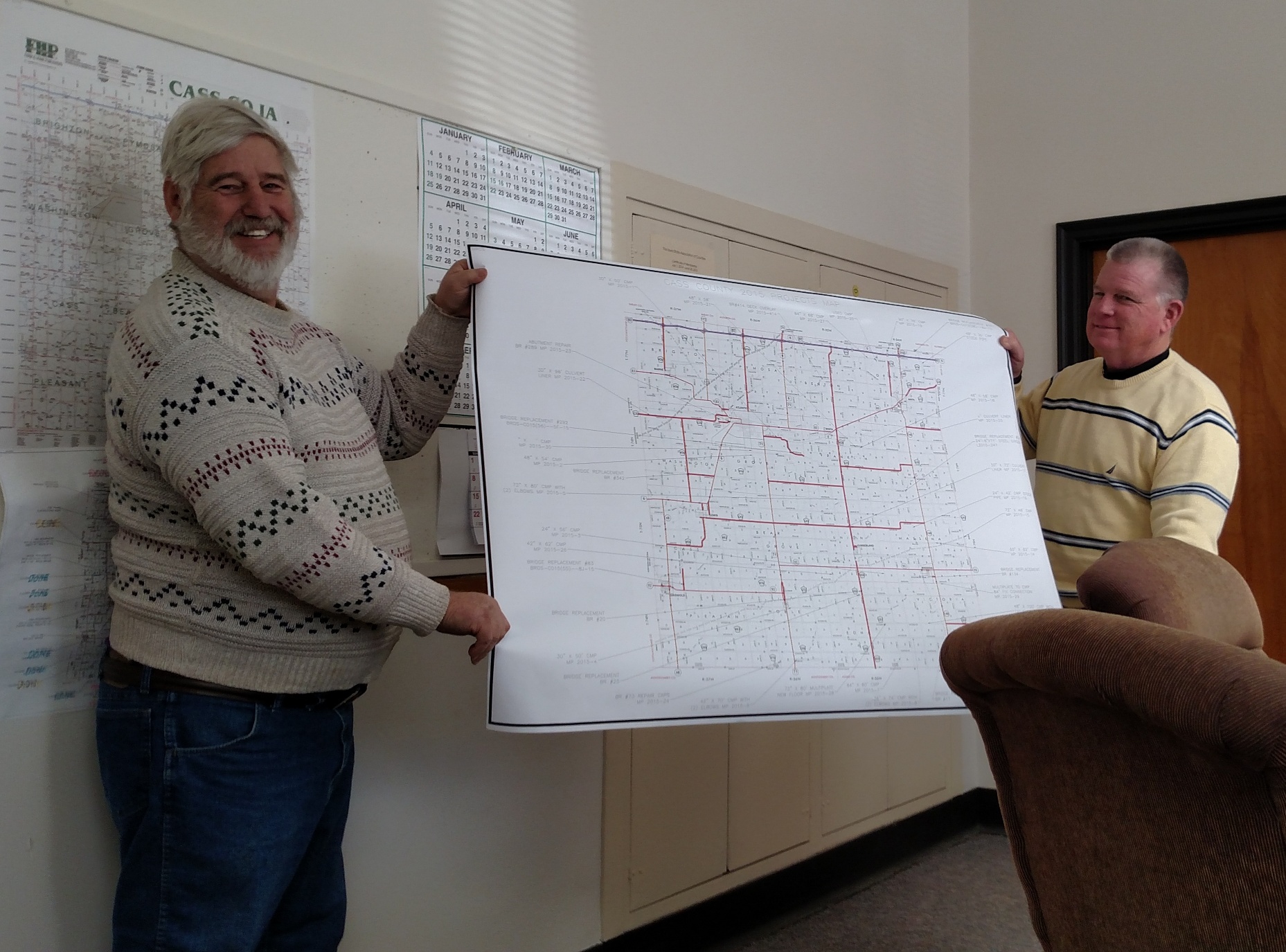 Cass County Engineer Charles Marker (left) & Supervisor Gaylord Schelling w/a map of County pipe/bridge projects.